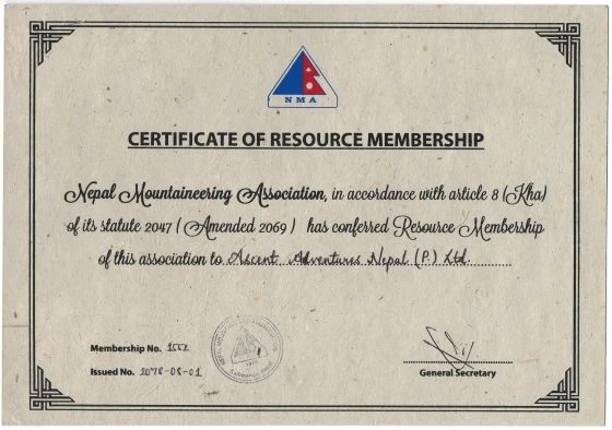 Certificate of Nepal Mountaineering Association (NMA)